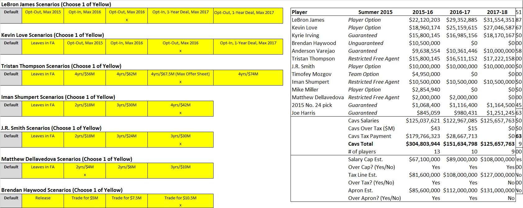Here’s one pretty simple scenario for Cavs that would nearly double Brooklyn’s record $90.6M tax bill… LeBron and Love both opt-out, sign new 2-year max deals with 2016 opt-out, then sign long-term max deals next summer. Tristan gets 4/$67M max offer sheet. Shump gets 4/$42M. JR gets 3/$30M. Delly gets 2/$4M. Haywood traded for equal $10.5M in salaries. Boom. The final result: $125.0M in player salaries … about $43M over the $81.6M tax line … so that’d be $179.8M in taxes. That’s pretty fun.