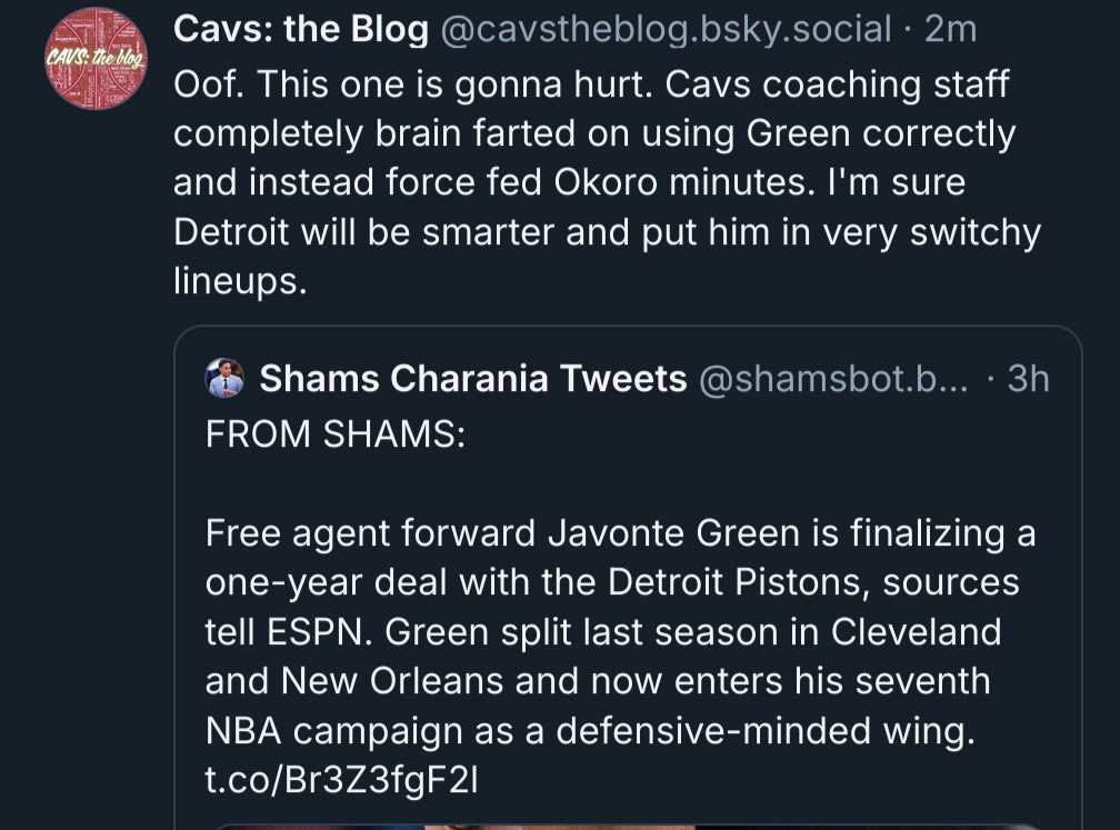 it didn’t appear the Cavs had any interest in signing Greem for this year, so going to the Pistons seems to be a BFD.