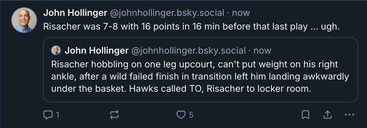 KAT downgraded to doubtful. Dang. I was hoping the Knicks would do something dumb (though I never root for guys to get hurt).