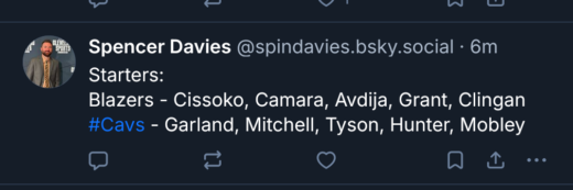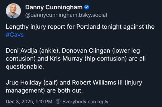 2025-12-03The battle versus malaise continues on a cold Wednesday night in December as the Cavs host the Blazers. Lonzo Ball is back, but Allen, Merrill, Strus, and Nance are still out. For the Blazers, they’ve still not announced who’s playing and who’s out 20 minutes to tip.