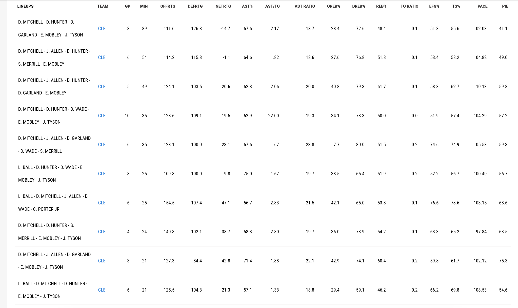 GIVEN UP 12 THREES AND THEYRE SHOOTING 60% MOBLEY ZERO REBOUNDS ZERO BLOCKS ZERO STEALS, JARRETT ALLEN ZERO BLOCKS ZERO STEALS GARLAND ZERO STEALS